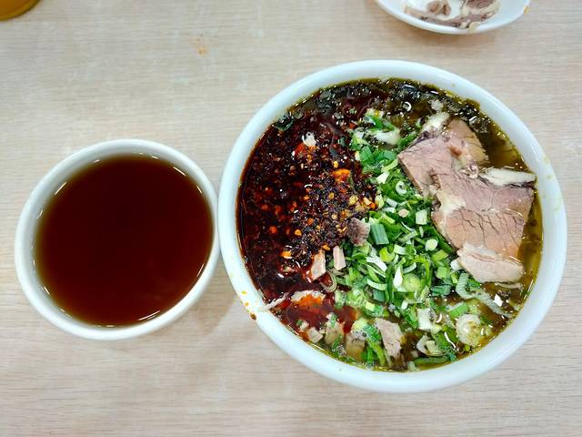 满满的一碗面里有大片的牛肉、香而不辣的辣椒油、一大把的葱花简直是妙,大口吃面大口吃肉真的是暖心又暖胃。