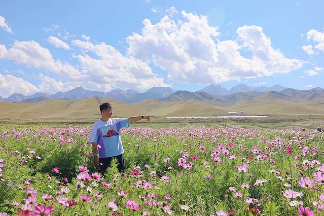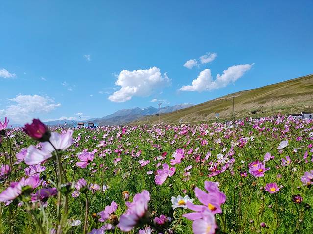 中午我们停靠天祝藏区吃午饭,虽没去过西藏但知道格桑花的存在,在饭店门前我就发现了这片格桑花海,饭后我们沿着小路走进花海一顿拍照,此时在想就差一条花丝巾在空中飘扬啦。