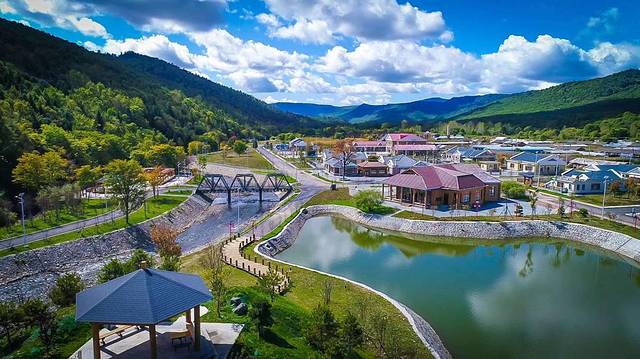 ②老白山影视基地一期——社会主义新农村,是老白山原生态风景区精心打造的集影视剧生产、文化旅游于一体的影视文化旅游区。新农村影视基地总占地面积为3公顷,由15栋特色房子组成,融入了延边朝鲜族地域风情元素,与老白山地区的民风、民俗相得益彰。走进其中,现代农村气息扑面而来,村道干净整洁,房屋错落有致,一片温馨,村情融于美丽的老白山景色之中。