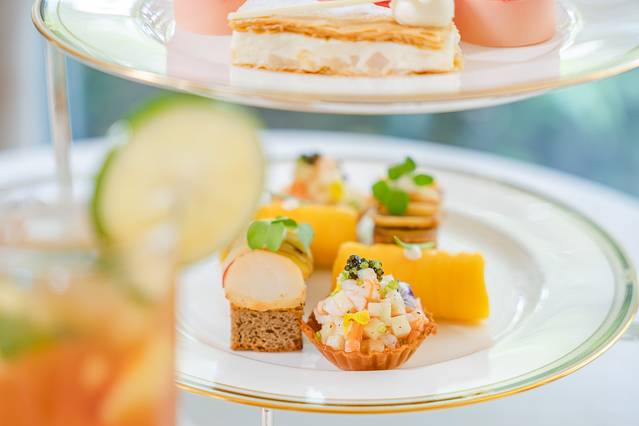 【桃李芬芳】下午茶包含:黑麦包配澳洲带子脆李、水蜜桃虾仁塔配酸奶油、蜜桃鸭胸墨西哥卷饼、蜜桃酸奶蛋糕、白桃伯爵慕斯、迷迭香杏仁脆李挞、蜜桃布雷斯特泡芙、蜜桃拿破仑蛋糕、司康饼配蜜桃果酱·香草奶油,含2杯桃李多多水果茶、含2位咖啡或茶。