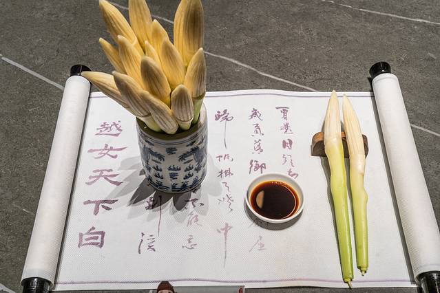 清蒸回山茭白,唐诗别称“越女天下白”。出自杜甫的《壮游》,在当时当下的杜甫眼中,越女之美无可替代,而这道清蒸茭白之美也是如此。新昌特产的山野小茭白,一般不等其长大就采摘收割,此时的茭白最为美味,经过烹饪摆盘后,色香味俱全,极有食欲。