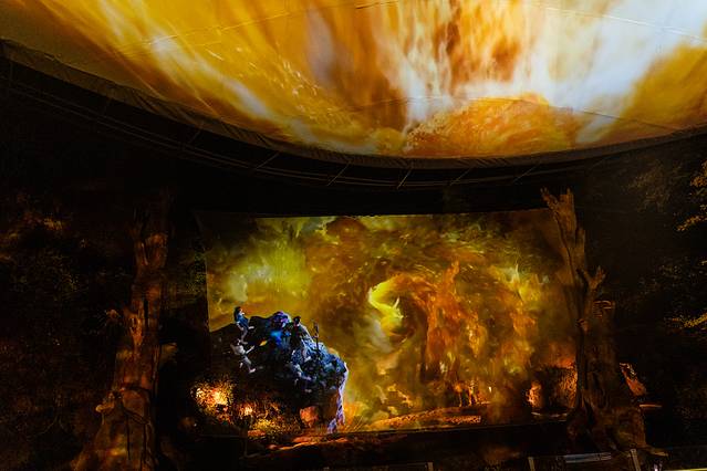 身处亿万年前的峡谷,滔天的洪水从天而降,伫立在崖石之上的耒耜守护着它的英雄……游客在夜游开始可以在服务台领取耒耜,启动后在游览途中可以用来启动触发很多意想不到的奇幻体验。