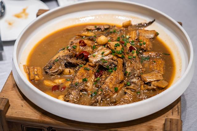 跨湖楼的越王东坡鸡、清蒸风带鱼、农家大三鲜、红烧杂鱼、特色酥鱼、话梅酱萝卜、梭子蟹炒年糕等等,美味的难以形容。