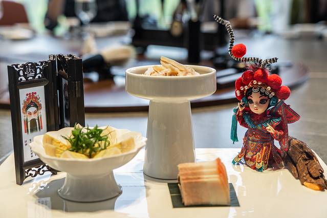 天姥唐诗宴的每一道菜都对应着一句唐诗,比如第一道的茶炉天姥客,虽名为“茶”实则是一盅好汤,“茶炉天姥客”一名,出自温庭筠的《宿一公精舍》,结合新昌的茶与佛道之文化,这道汤品外敛内放,独树一帜,茶汤有烛火加热,可以慢慢喝慢慢品,不用担心汤凉。