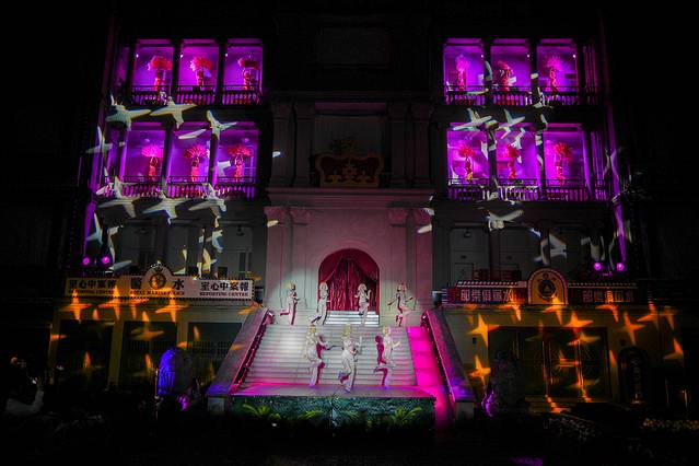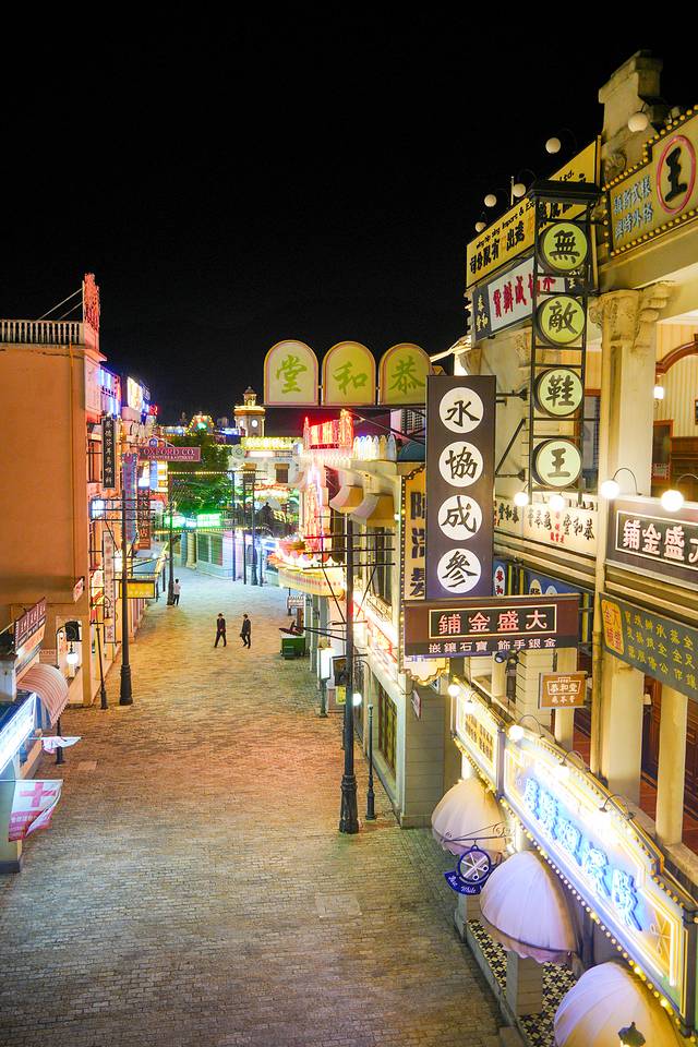 香港街夜景坐落于横店影视城广州街香港街景区内香港街区维多利亚港区域,德辅道、毕打街、皇后大道、干诺道、遮打街环线打造极具19世纪老香港风情的建筑群,并融入影视场景、美食小吃、娱乐酒吧、潮流商业、演艺秀、小品景观等。