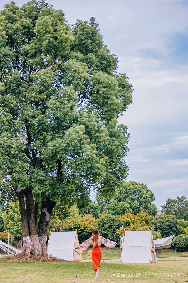红艳似火的石榴压弯枝头,每棵树都经过精心修剪,线条优美,再加上巧妙的布置,搭配水榭亭台,连缀成片,纵横成林。中式的园林,儒雅大气,犹如水墨山水画卷。绿色的草坪,点缀几棵冠如华盖的古树,配上白色的帐篷,已胜过众多千篇一律的网红露营地。