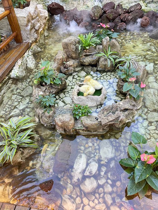 瀑布中间居然还有活的小鸭子,宝宝很喜欢