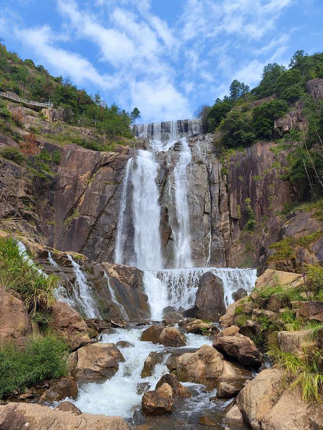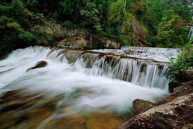 它不仅是中国十大瀑布群之一,更是号称中华第一高瀑,落差达 325 米,最宽处100米。九级瀑布犹如一幅立体画卷倾泻直下,气势磅礴,“轰雷破石响空山,直疑天上银河水”的壮丽景象,如同一条巨型白练在绿意盎然的群山中飘舞,构成了一幅立体山水画卷。