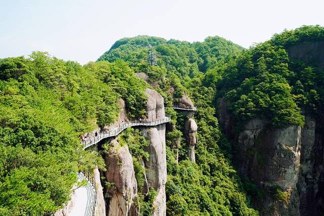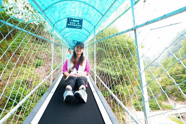沿着游步道逆时针环游神仙居,依次经过鸿蒙桥、卧龙桥、圆梦桥、如意桥等一座座悬空桥。