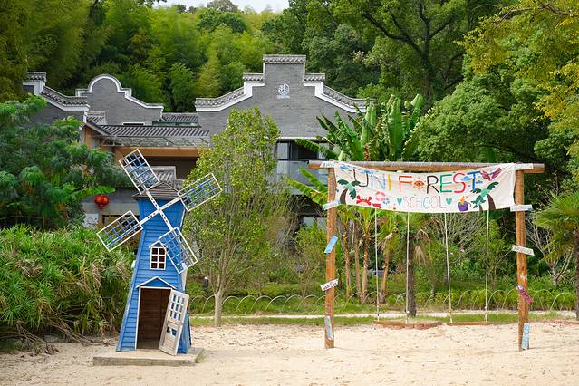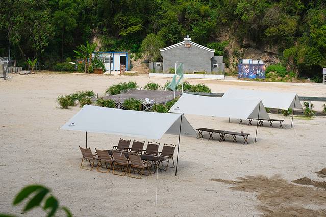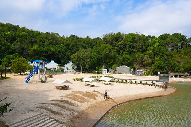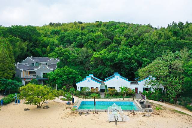 走一段路就来到了蜃海湾沙滩,这里是这个岛上唯一一个网红打卡点。这里有民宿、餐厅,咖啡吧、泳池、沙滩、天空之镜等等,一般游客到岛上玩最多的地方就是来到这里。还有一些露营的帐篷,约上几个好友到岛上住一晚,体验一下这里宁静的环境,感觉一下海边的乐趣。