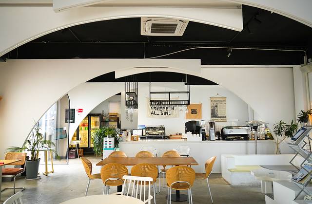 这家咖啡馆坐落在 宁海 码头旁边,外观是白色的一层房子,外面就是大海,纯白色建筑加拱门落地窗的设计,搭配着蓝天白 云和 大海,瞬间感觉切换到了度假模式。店里拱门的设计风格,有很多座位,ins风格。