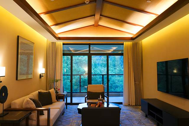 宁海 天明山森林温泉酒店是一座藏匿在仙境森林中的私汤温泉酒店。酒店被四周茂密森林所包围,走进酒店仿佛来到了绿野仙境森林般。入住约100平米的行政套,一打开房间就让我惊喜万分,客房很大,而且有一个非常大的露天阳台。