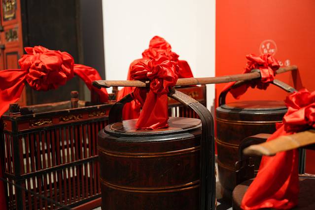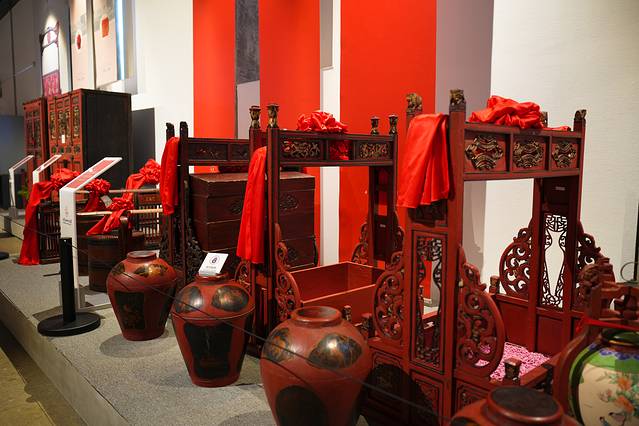 展厅中陈列的物品非常丰富,婚房、床铺、家具、瓶瓶罐罐一应俱全。不仅感受到那时婚嫁的豪华,更是淋漓尽致的展现了红妆之美,清一色的朱红色物件,让整个空间显得格外喜庆。
