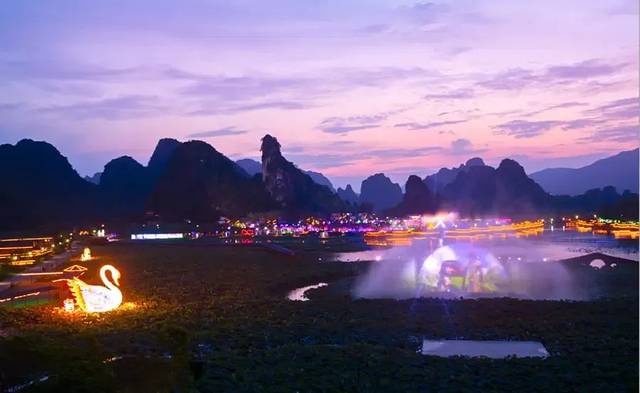 最后一站我们来到了峰林梦幻城,夜场开始之后,这里的夜场灯光秀就开始了!当英西峰林邂逅水幕灯光艺术,用光与影谱写出浪漫的夜游之旅!灯的世界、音乐的海洋,峰林晓镇水幕电影灯光秀真的给我和闺蜜们来了一次震撼的视觉盛宴!不仅是水幕电影灯光秀,远处漫月飞仙大月亮也亮了起来,非常诗情画意,这趟旅程的趣味度可以给五星!来了绝对会找到快乐的一个目的地!