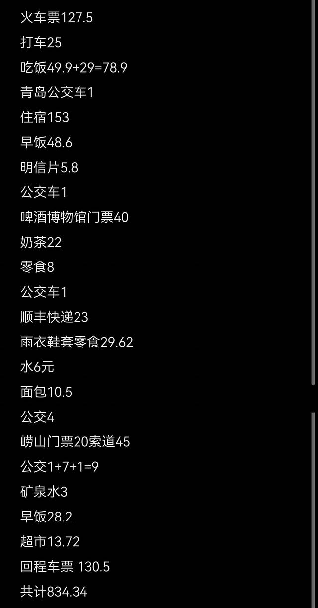 一共花费800余元 禹城出发 到青岛火车票 单程一百多 青旅3晚共计153 点了几次外卖 买了面包矿泉水 另外崂山和博物馆其实提前约好都是可以不花门票的 但是我比较随缘