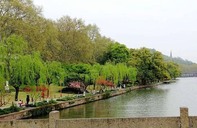 苏堤春晓的春景现在不能看到,但秋天也是景色美丽,又长右直的苏堤,将西湖分为东西两部分,东面是外西湖、里面是西里湖,苏提两边种满杨柳树,满堤都是绿树萦绕,柳枝依依飘飘,桃叶悠悠摇摇,一番苏堤秋风美景。后来我分别从南边、北边两次走进苏堤,看到更清楚的是,柳树下有假山花木、石路小径、湖岸草绿,更在树下游人漫步、情人私语,一个约会的好地方,一幅浪漫风景画。