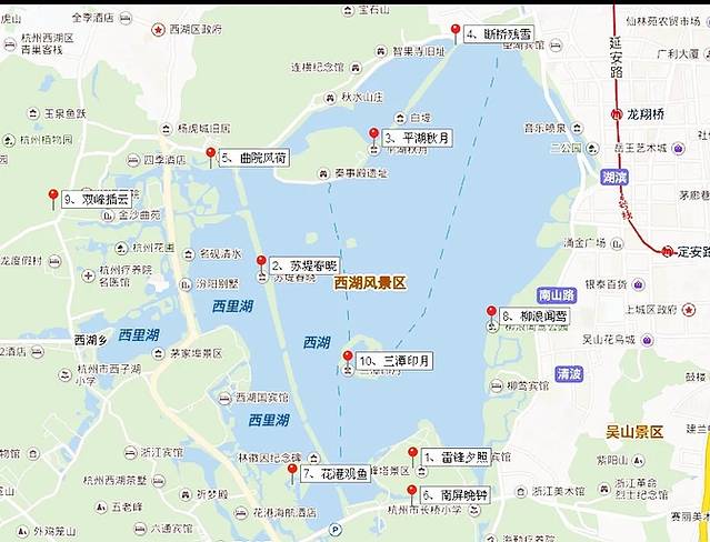 (十景:苏堤春晓、曲院风荷、平湖秋月、断桥残雪、花港观鱼;南屏晚钟、双峰插云、雷峰夕照、三潭印月、柳浪闻莺)