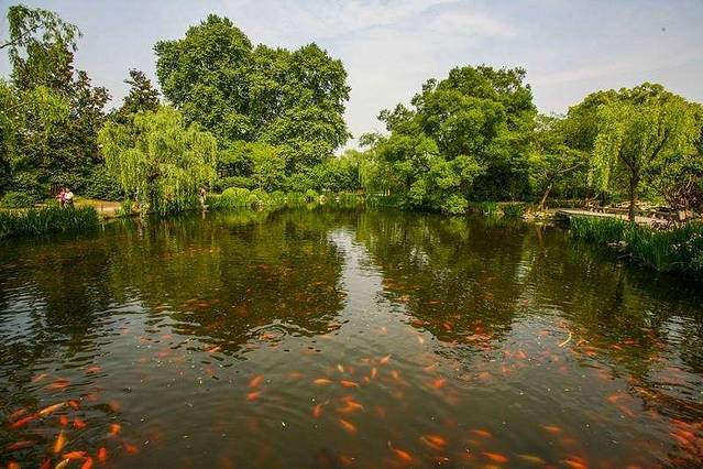 往西看看是曲港观鱼、苏堤春晓景区。曲港观鱼在一片公园中,小南湖旁,亭台楼阁,池塘湖汊众多,可以想象一下肯定是也有鱼翔浅底,嬉戏热闹,观鱼的绝佳处。