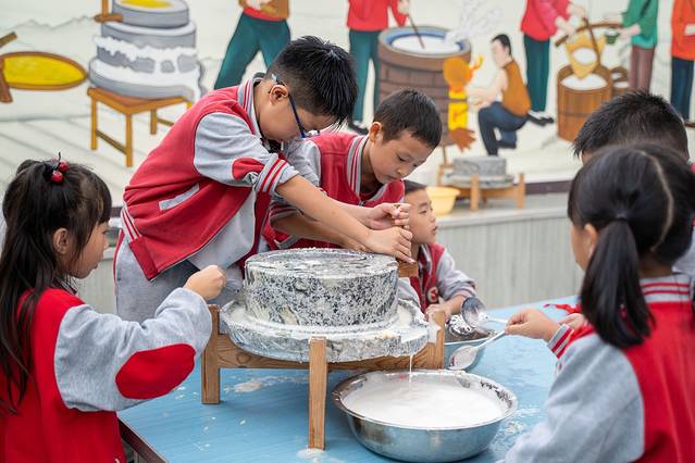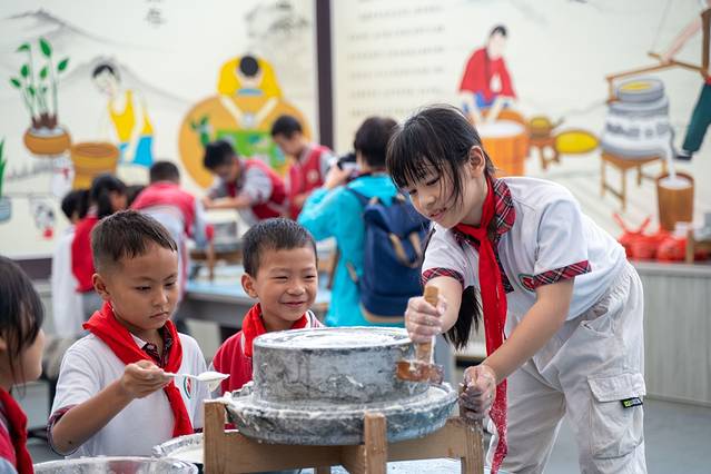 在农耕园内,还有着非常有趣的体验,来到农耕园时恰巧遇到学生来这里研学,他们几个人一组体验用传统的石磨制作豆浆,场面非常的有趣,小朋友也很乐在其中。他们分工合作,有的人负责转动石磨,有的人负责添加黄豆,有的负责搅动豆浆,他们合作的非常好。