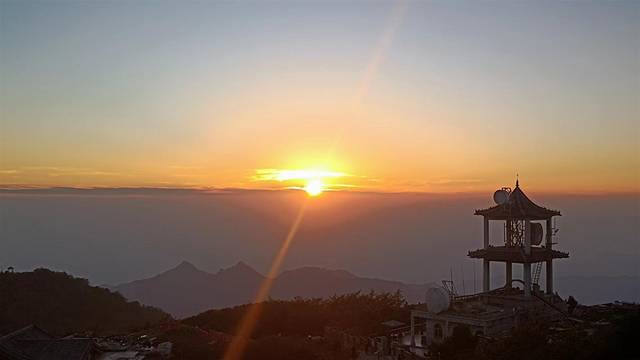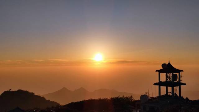 在山顶游览过后,便开始找寻赏日落之地。想到应该到最高处,便到玉皇庙大门旁边的围栏处开始赏日落。