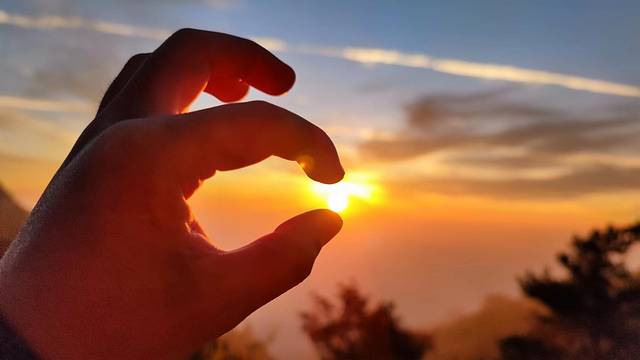 和海上日落相比,山顶日落一直到结束都很刺眼,而海上日落在后期会变得很柔和直至肉眼可见。大概还有20分钟才完全日落,此时没法直视太阳便开始做好拍延时的准备。