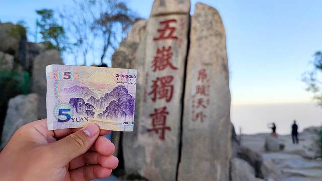 到达玉皇顶时,距离日落的时间还有40分钟左右,便在周围参观了一番。由于临近日落,此时五岳独尊石刻碑已经没有阳光,但还是找出五元人民币于其合影。