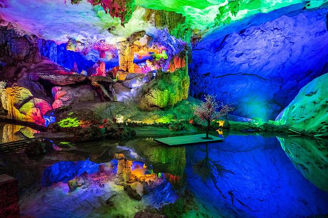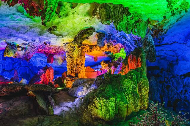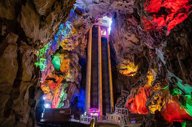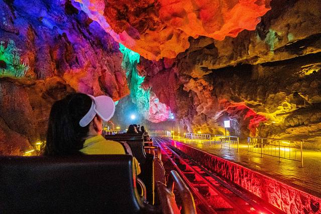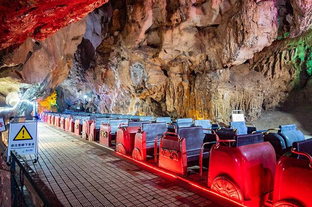 这个溶洞里有多大空间呢?上上下下会走一些,沿途所见的钟乳石时而大气磅礴、时而精致细腻,美景变幻莫测。明明是在一个洞内,却像是看走马灯一般,不停地在变换。除此之外,洞里还有轨道小火车可以乘坐,是必体验项目。