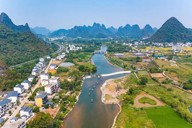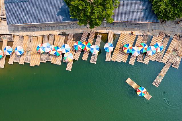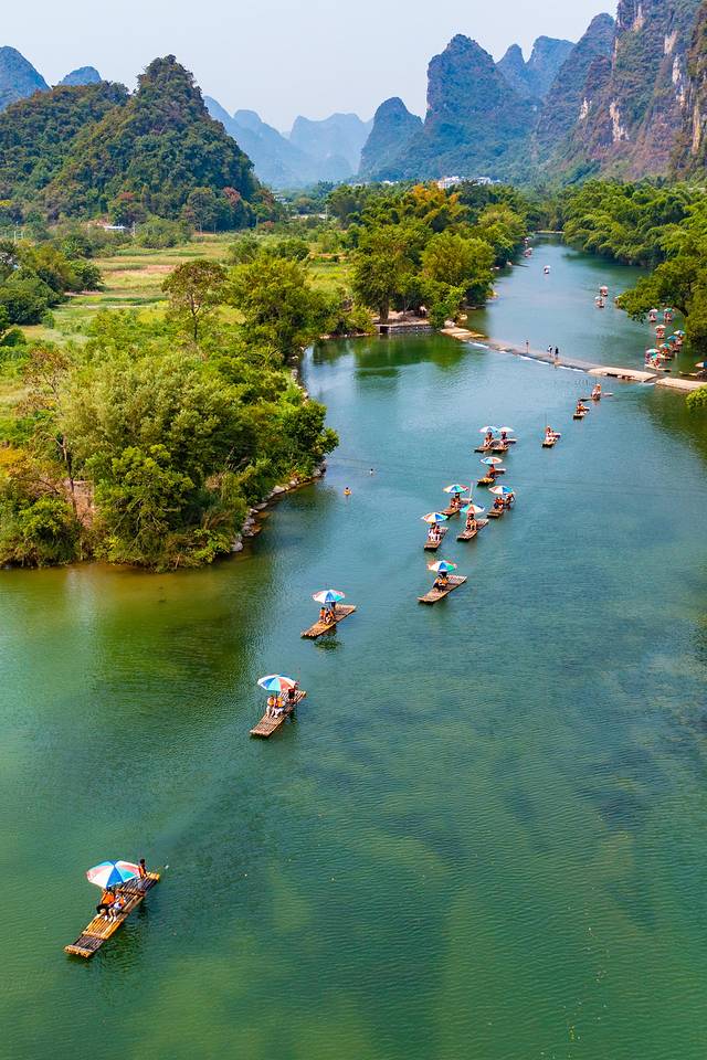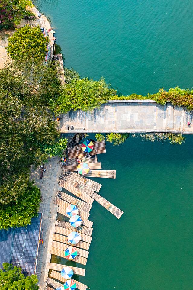在这里我也用无人机航拍了很多照片。虽然桂林阳朔的风景看起来十分开阔,但无人机信号相对较差,河面周边或许还有看不清的细线缆、树枝等,建议在目视范围内航拍,也不要飞的过低。