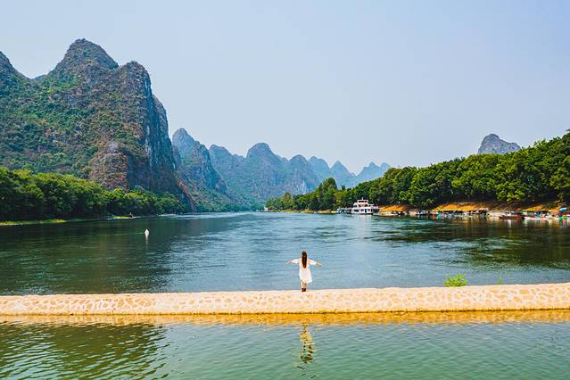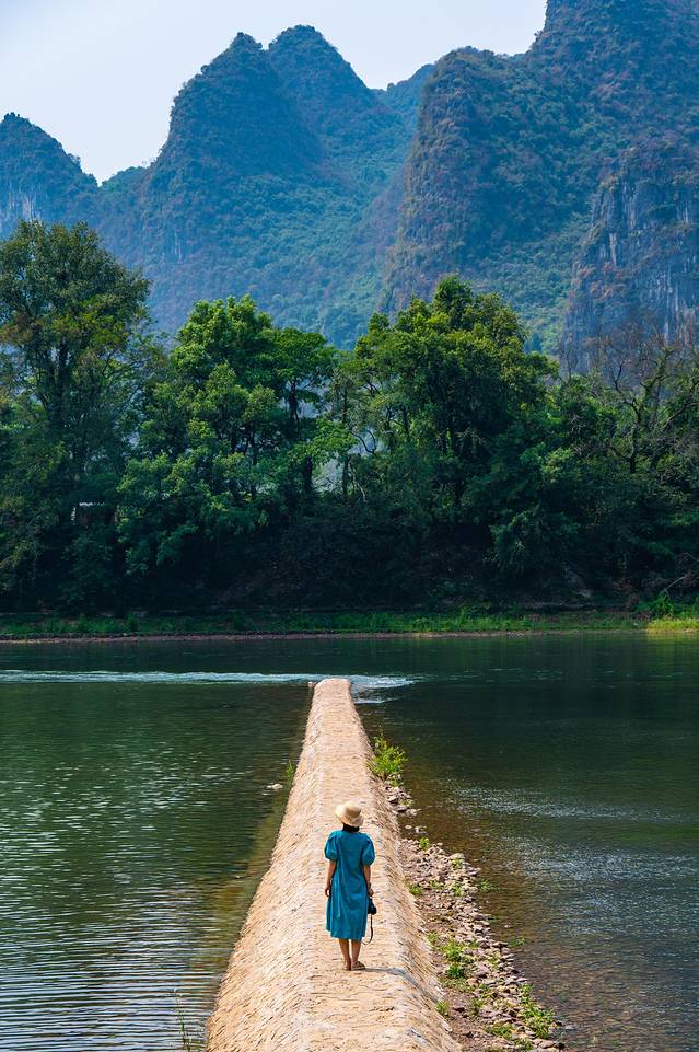 冠岩景区也不仅仅只有这个溶洞可以玩,洞外的漓江边也是拍照的好地方,航拍看起来更是气势恢宏。女孩可以走上延伸到漓江上的小水坝(不知道说的名字是否准确,看下图吧)上拍照,格外仙气。这可能就是漓江山水风光的魅力吧!