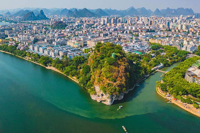 下面这个略高一些的正面俯拍,很多朋友表示很喜欢。因为象尾的部分正好就连着桂林城区,远处还有层层叠叠的山峰。一位没有来过的朋友表示,原来象鼻山居然是在城区的啊?对呀!桂林就是山中有城,城中有山,山就是这么毫无逻辑地拔地而起。而且为了配合旅游,桂林市区也不会规划建设高楼,象鼻山也不用担心被钢筋混泥土所湮没。给山水让步也是一个很了不起的举措。