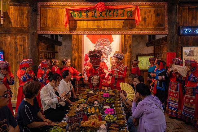 福溪村除了有着浓郁的田园风光和喀斯特地貌山水风光以外,游客还可以体验当地的哭嫁民俗。我们同行的小伙伴就非常“幸运”地成为当天的新郎,原生态的婚礼仪式在村子里的好几个场景里举办。整个仪式的参演人员除了“新郎”以外,其它都是村子里土生土长的村民,讲的也是当地方言,所以我是一句话没听懂,但也和“新郎”一样乐在其中。