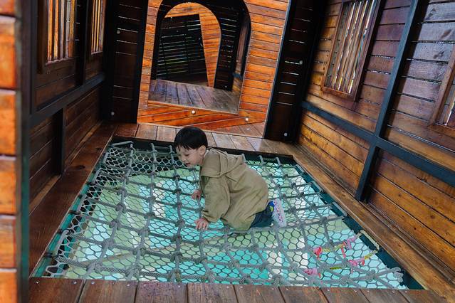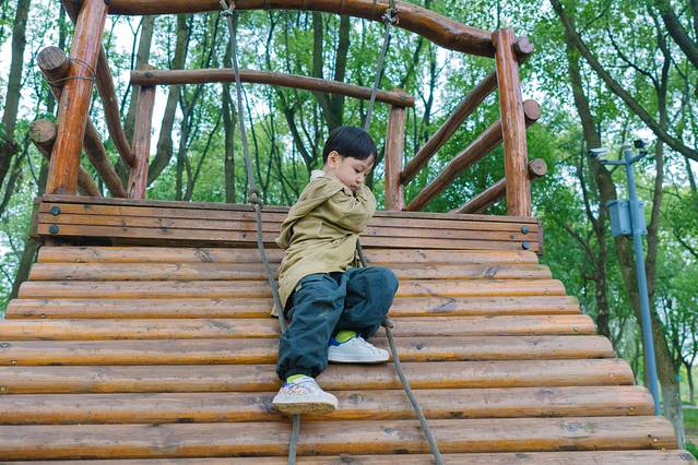 勇敢者道路是训练胆量的,这里的设施可真是经典不衰,从我们小时候就已经有了,梅花桩,攀爬墙,满满的回忆杀,忍不住自己都要上去,重新展示一下伸手。
