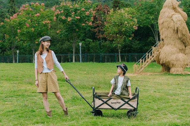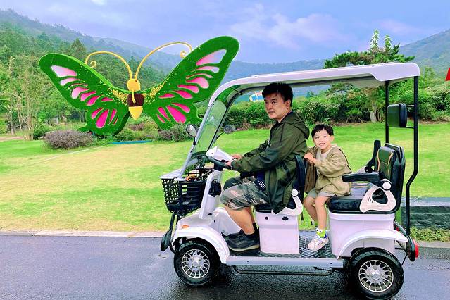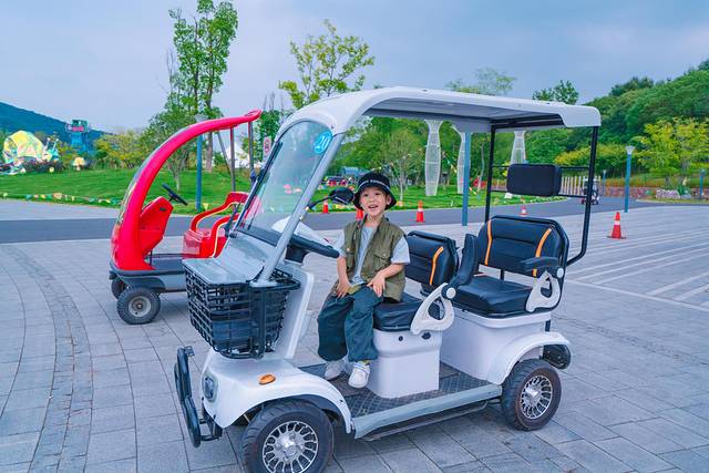 进入园区后,小家伙已经迅速的跳到园区内的电瓶车上了,事实证明,他的选择是对的,因为整个露营谷很大,非常的费脚力,而这个电瓶车速度虽然不快,但超级适合遛娃,走哪儿停哪儿,还能堆上给他带的各种补给物,景区入口右手处就有办理租借。