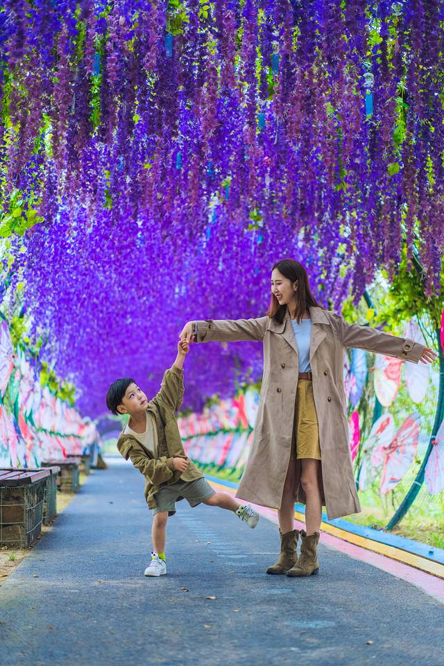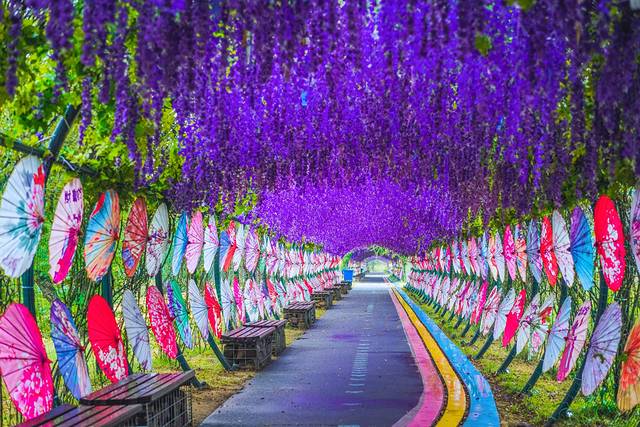 我们遇见了爱情隧道,然后在紫藤花下漫步跳舞。