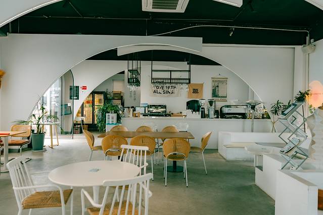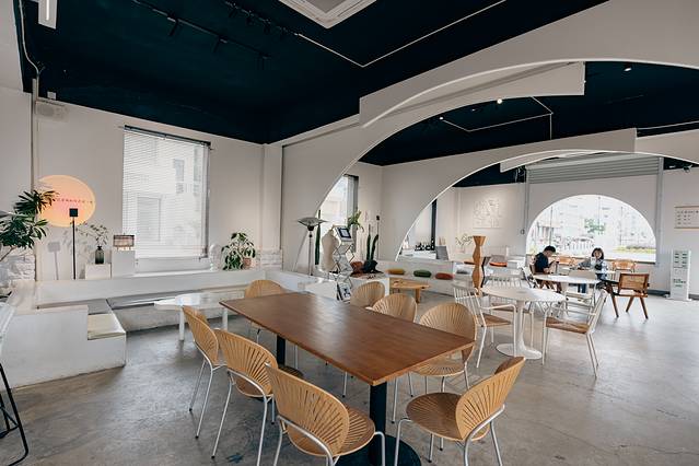 咖啡馆用了很多圆拱形的设计,非常时尚,通体白色,里面的桌椅也大多为白色,几棵绿植的点缀,拍照做前景恰到好处。