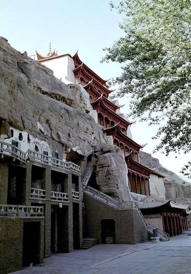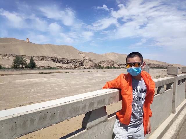 摆渡车送到莫高窟入口,鸣沙山东麓。门口是大泉河又名宕泉河,眼前干涸得像在火星。桥对面得断壁山脉大大小小的斑驳洞窟显得很苍凉。