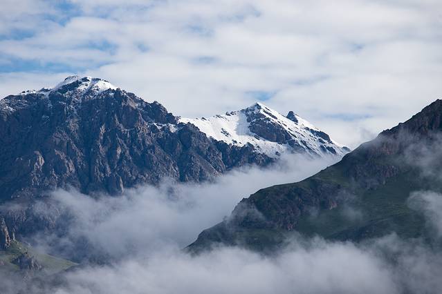 山脚下的油菜花田地,还有远处的祁连山脉,丰沛与贫瘠的反差。看着山下一辆旅游巴士陷在了泥泞的草甸,正倔强的在掉头,这都能感觉画面很美。远处的雪山趁着一阵阳光撕开的云雾,显露出来,神圣而庄严的感觉。