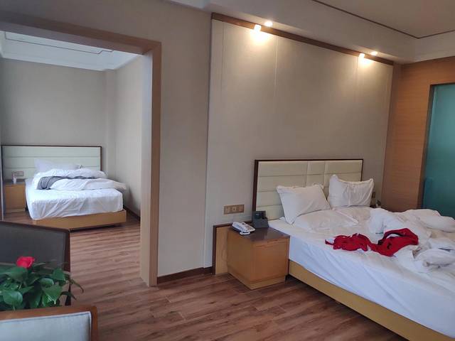 凌晨的嘉峪关火车站与10多年前相比,陌生了许多。迈出车厢,干燥凉爽的空气立刻让人觉得熟悉与兴奋,全体集结好人员、整理好行李,悉数赶往宾馆。这里不得不着重推荐下团队下榻的宾馆——我的家商务宾馆亲子间,房间是这样的:
