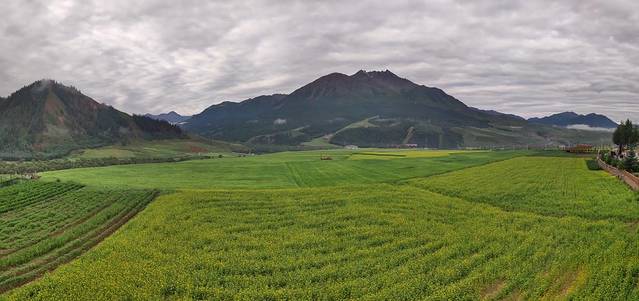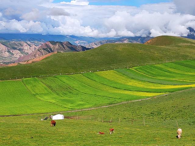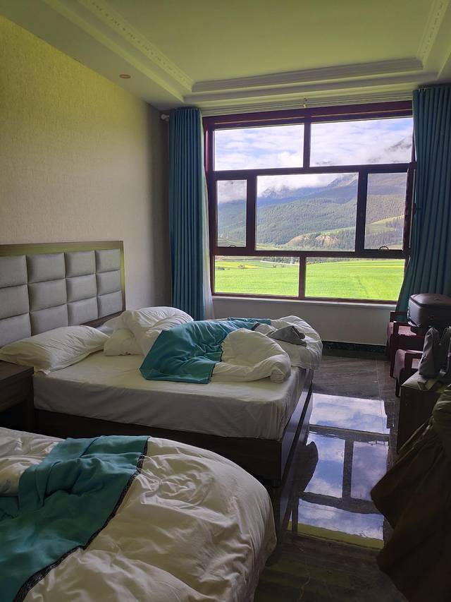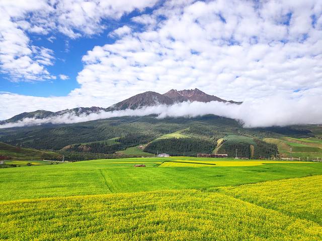 隔壁一排房间陆陆续续都能听见“卧槽”的赞叹,东方瑞士名不虚传,这个景真是环青海湖最棒的体验。就这么站在窗边,看着窗外的金黄油菜花田,与远处的碧绿的草甸界限分明,浓绿色又向山顶挣扎着蔓延,直到遇到了雪线才放弃了。在这18度的早晨,除了山谷里的鸟叫,我都不敢大声的喘气,生怕破坏了这世外桃源的宁静。山腰一团顽皮的白云,看着它时就静止了,一不留神又开始浮动起来,就这么看着它从视线里飘过。不敢相信这是在人间?绝对大制作的特效电影。有那么一瞬间想到,倘若人生终结于此,那也是一种幸运吧。