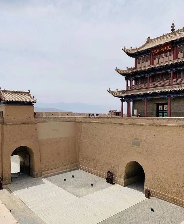 三座主楼自西向东分别为嘉峪关门、柔远门、光化门,导游小姐姐说如果从关外进攻,因为三座塔楼位于一个中轴线,从远处看重叠在一起,仿佛一座城楼,可以起到迷惑敌人的作用,不知道我可记错了。