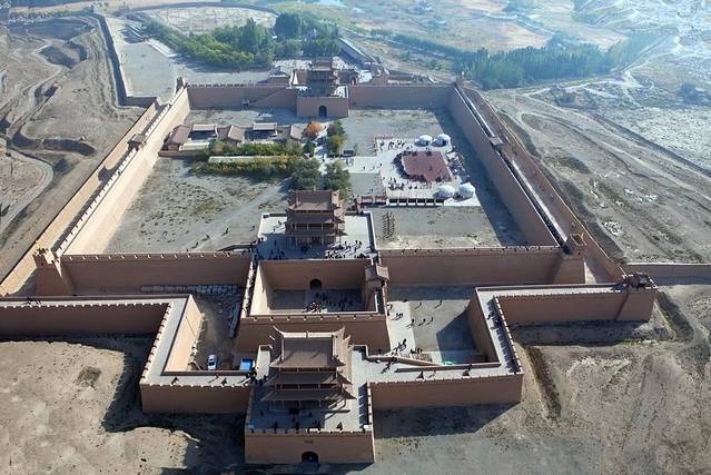 嘉峪关城楼为万里长城的最后一站,当时城关两翼的城墙横穿戈壁,向北连黑山悬壁长城,向南接天下第一墩。看看下面这张图就明白当年关城的军事战略地位了。什么叫河西走廊,什么叫咽喉要道,什么叫绝绝子。
