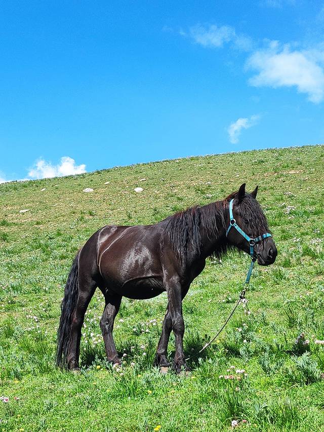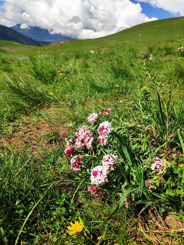 漫山的草原上散落着各色野花,最多的就是这种像蘸了糖霜的山楂花。散养的牛羊骏马随便吃着、拉着,无忧无虑。