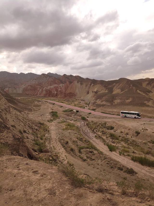 下午1点半左右,全体出发,目标张掖七彩丹霞景区。高速驶出城市,茫茫戈壁,只有耸立的输电线路和太阳能板才能告诉我们这里还有人的痕迹。远处祁连山脉阴沉着脸,整个高速路线都好像害怕它而躲避绕过。远处地平线上出现了一条黑色的毛虫,沿着大大弧线向我们移动。“是火车”,孩子们的呼喊揭开了答案。一节红色的内燃机车头,奋力拉动着几节绿皮车厢,就这样沿着铁轨与高速公路不停交错纠缠,一会从我们下面穿过,一会又并驾齐驱。