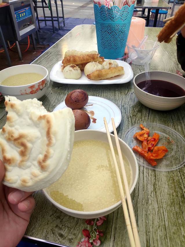 酒店没有早餐,就在马路对面都是早点摊位。品种有限,小米粥,红豆粥,包子油条,茶叶蛋,再来个小馕也能吃饱。生意火爆,这里成了周围酒店的游客早餐的聚集地。边上的小卖部买了点零食带着,才发现昨晚10元的酸奶,这边只要4元。