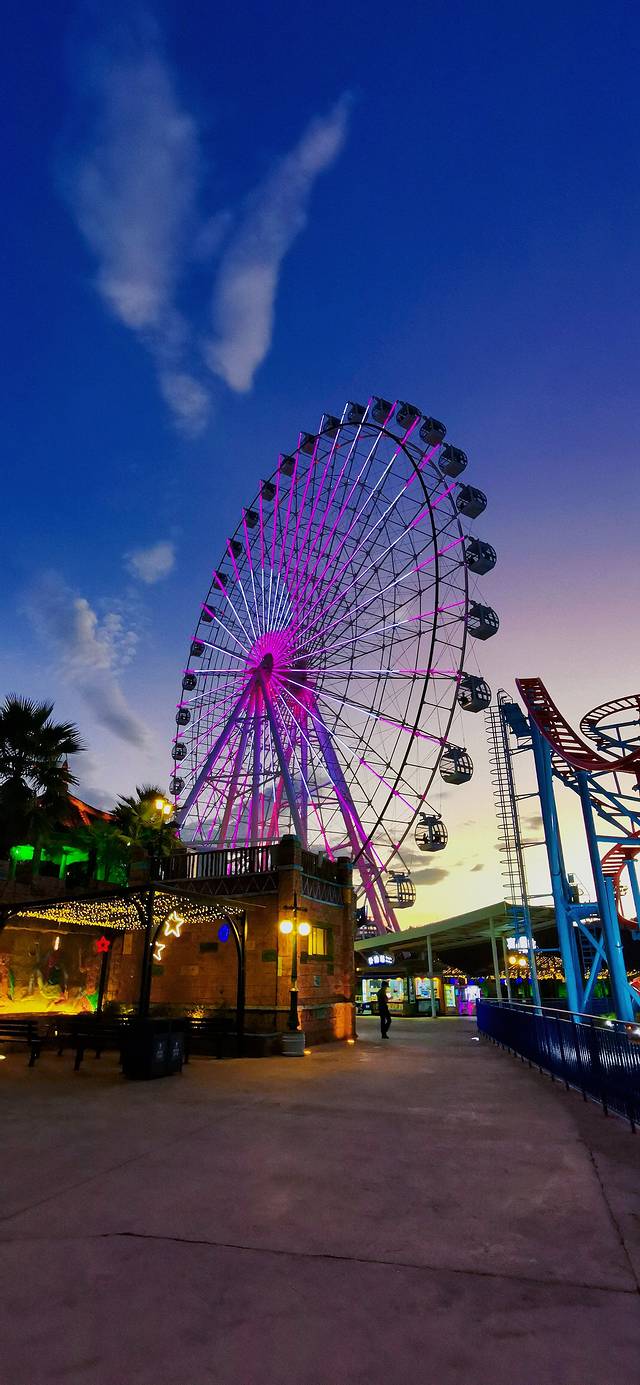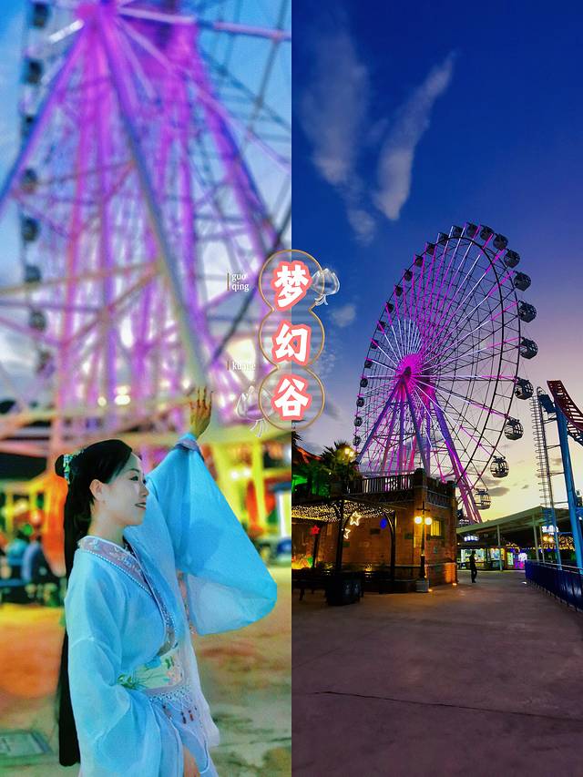 第一天晚上梦幻谷,水、陆、空游乐园一体,高空秋千,热气球、海盗船、旋转木马、跳楼机、疯狂马戏团 ,还有我醉爱的摩天轮;小朋友可以玩一天的游乐场,暴雨山洪、梦幻太极,视觉震撼,真的太好看了。