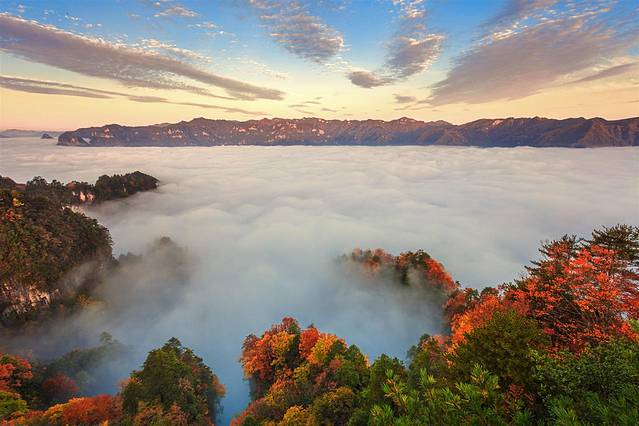 一览群山的彩林依山势起伏,冷傲的山峦与缥缈的云雾也被这满目绚烂赋予了一层更浓的意味,淋漓的展现着只属于秋季的浪漫~