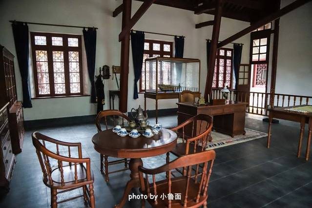 大门两侧为门房,如今是介绍丁汝昌生平的展室。寓所门前,矗立着高3.8米的丁汝昌铜像一尊。东西两侧建有红柱飞檐的六棱形凉亭。
