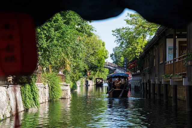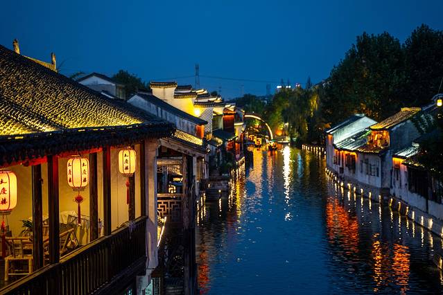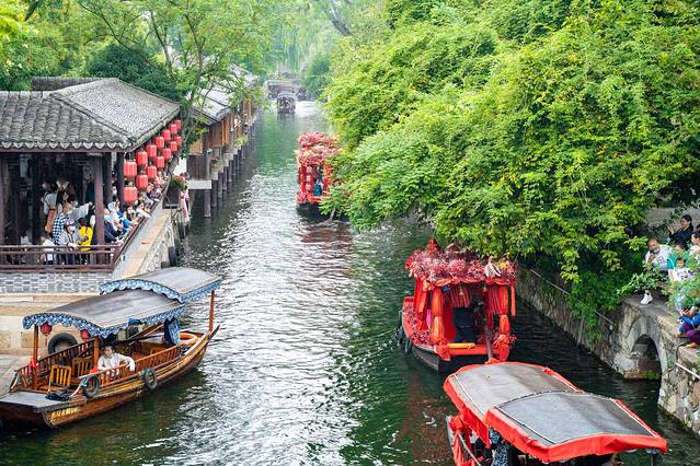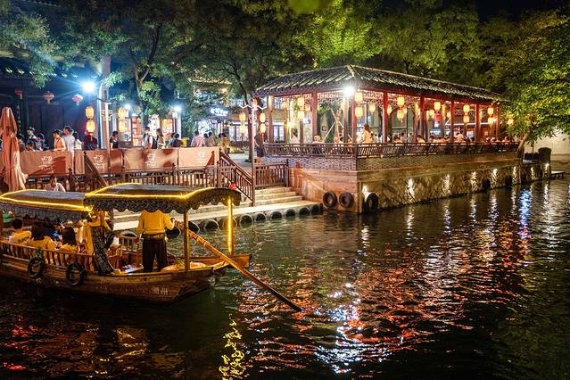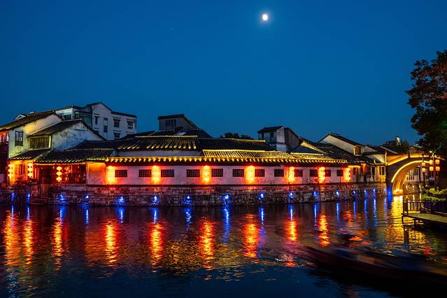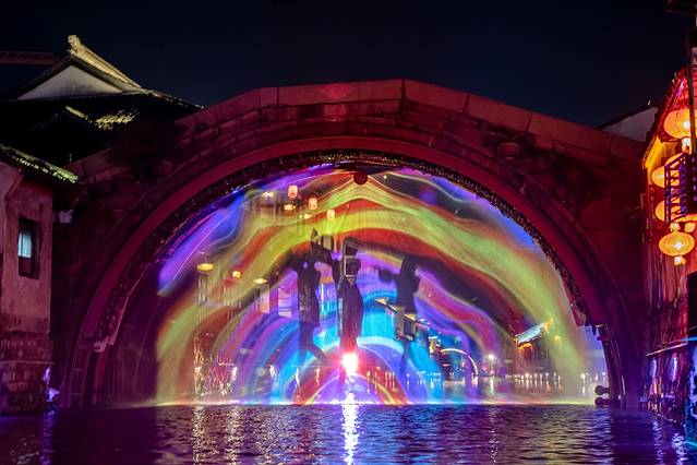 而想要领略水幕演出最好的方式便是乘坐游船了,坐在摇橹船上,看一场生动的水幕电影,欣赏绝美的水乡夜色。