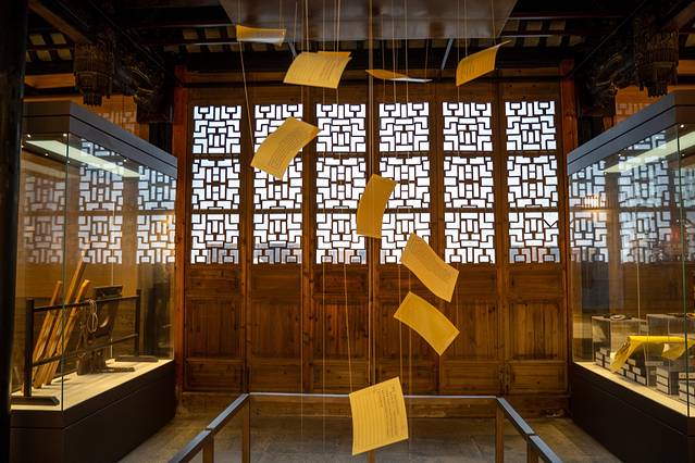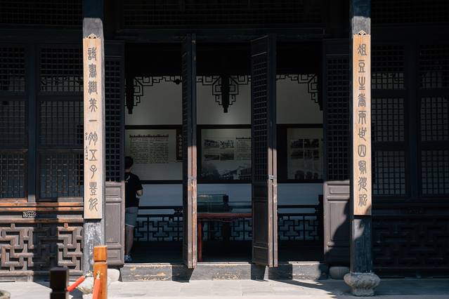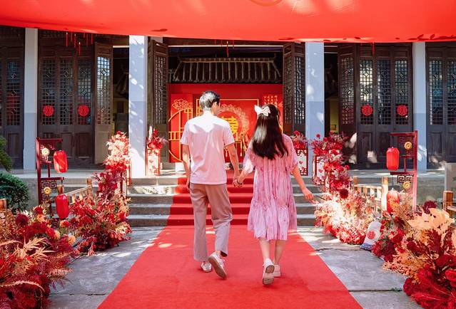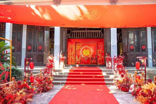 水乡婚礼的举办地点是在古镇里的辑里湖丝馆,这个馆主要展示南浔人自以为傲的辑里湖丝文化,当我们来到这里时,整个湖丝馆已经变了一幅模样,中式婚礼的装饰布景遍布各地,整个场馆里到处都洋溢着喜庆热闹的气氛。
