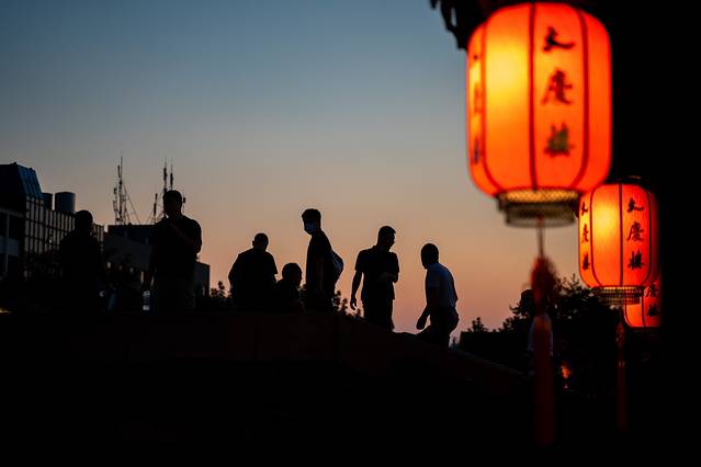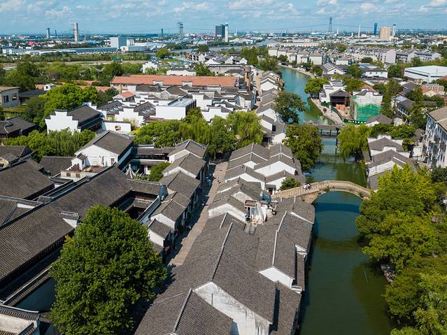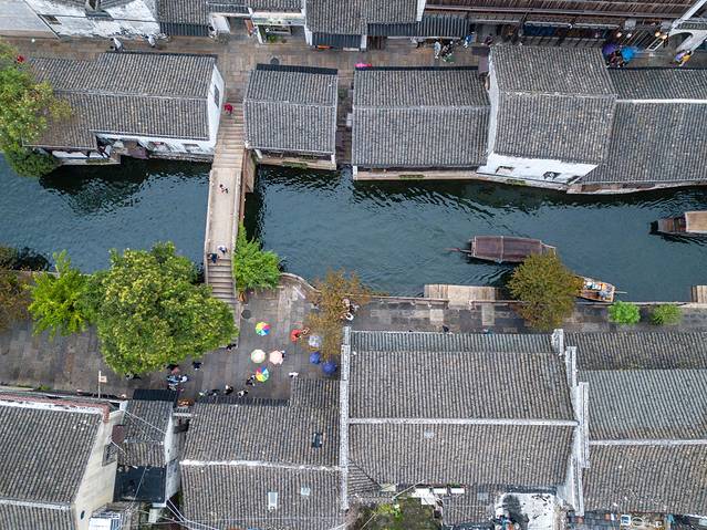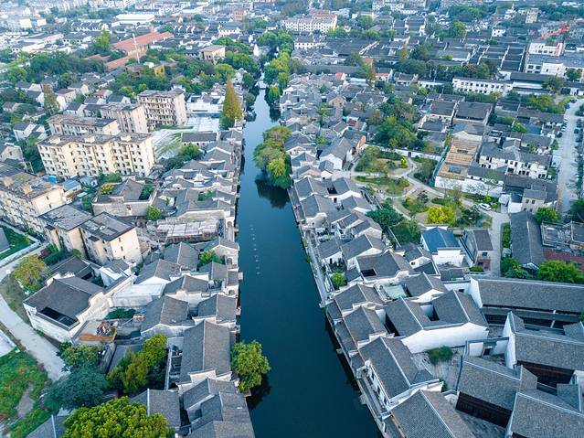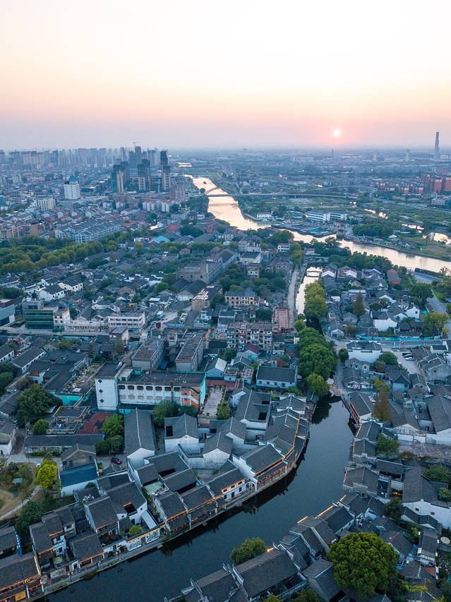 从清晨到日暮,从日出到日落,每一刻的南浔都散发着这座古镇的魅力。迎着日落,当无人机从南浔古镇起飞飞上天空,从天空俯瞰这座古镇,古镇的河道在夕阳的映衬下也变得熠熠生辉。